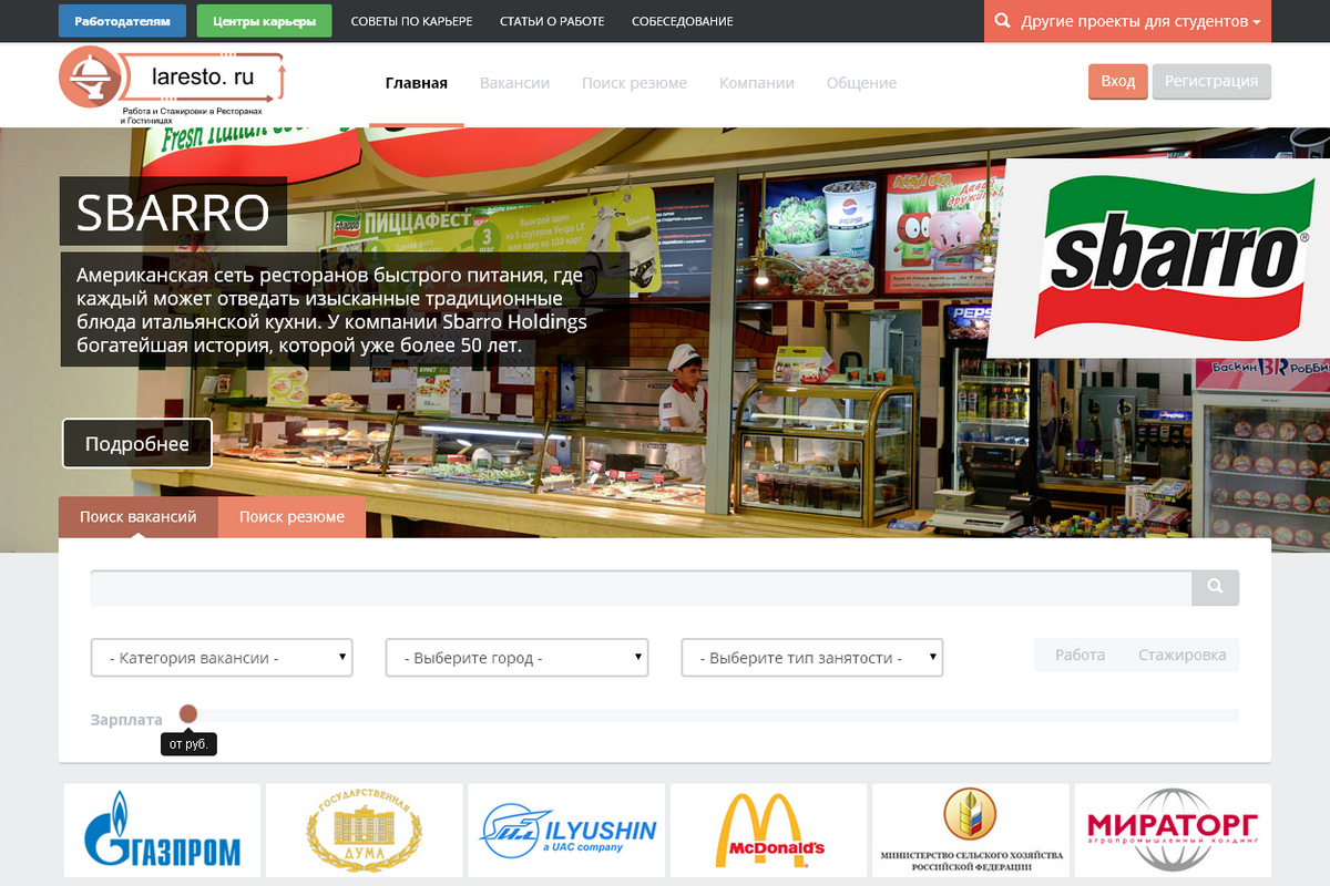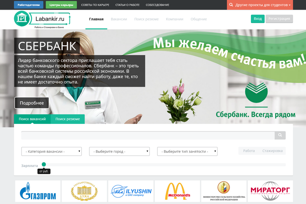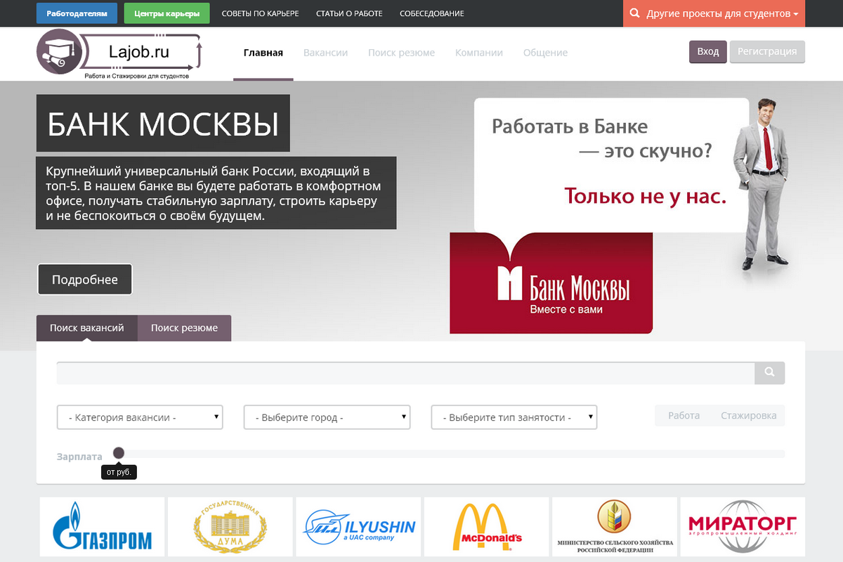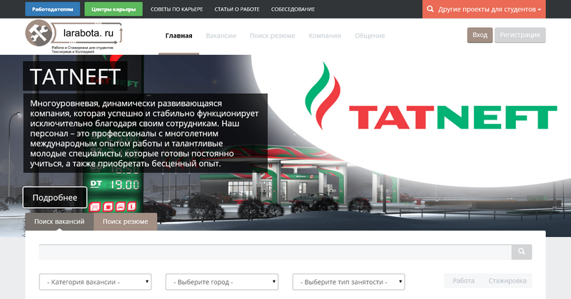 «После окончания института долго мучилась с поиском нормальной работы, пока не забрела на сайт Larabota.ru. Оказалось, даже у выпускников есть огромный выбор вариантов трудоустройства в серьезные компании»
